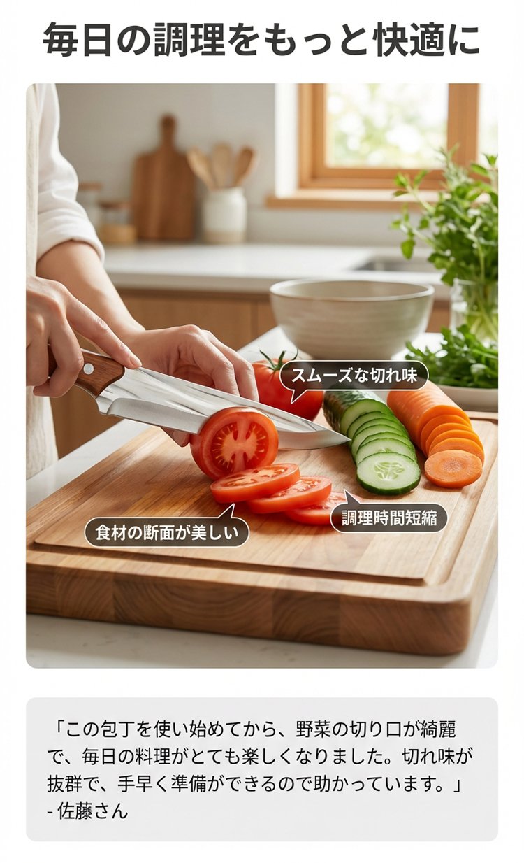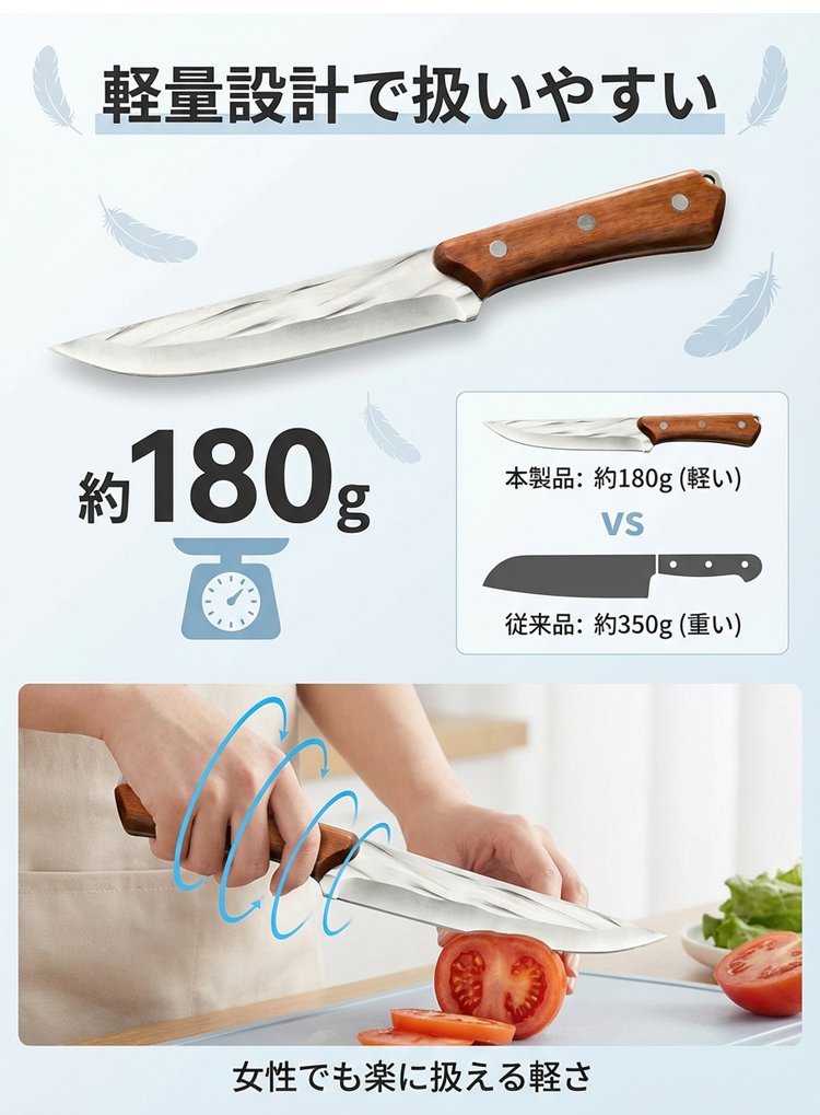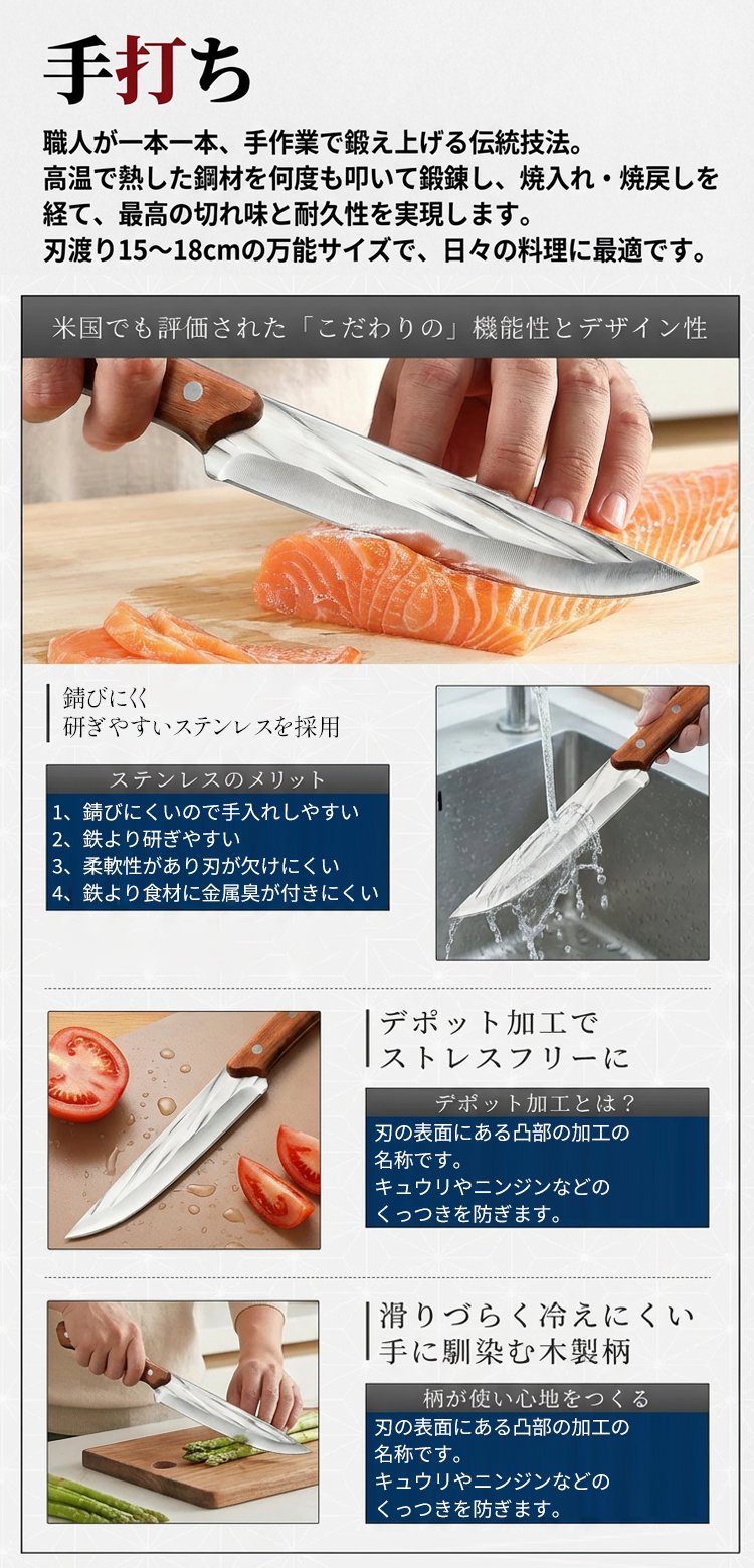 伝統の「ハマグリ刃(蛤刃)」研ぎで、抜けが抜群!、肉や骨を1万回連続で切断しても、刃先は新品同様の鋭さを保ちます!