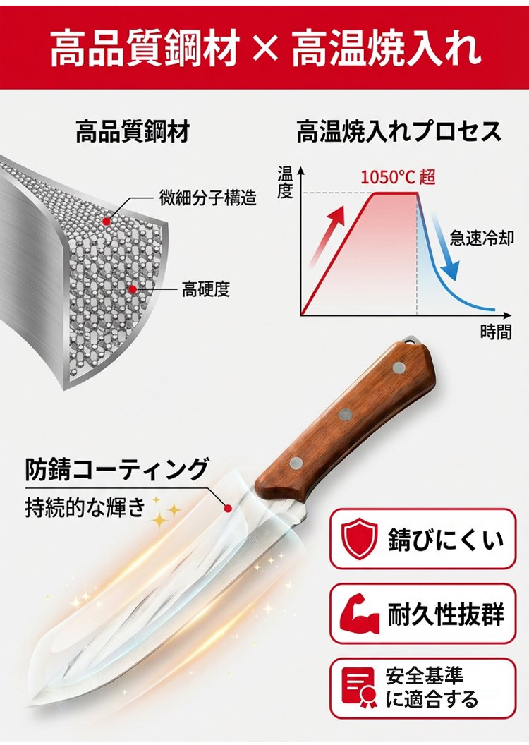 柄は皇室御用達の花梨木で、防腐防カビ。耐腐食性は通常の包丁の500倍で、20年間錆びません。